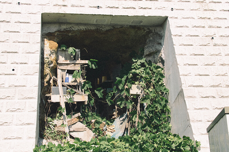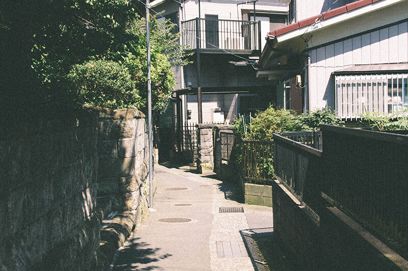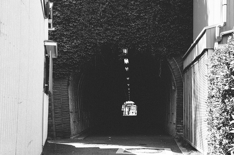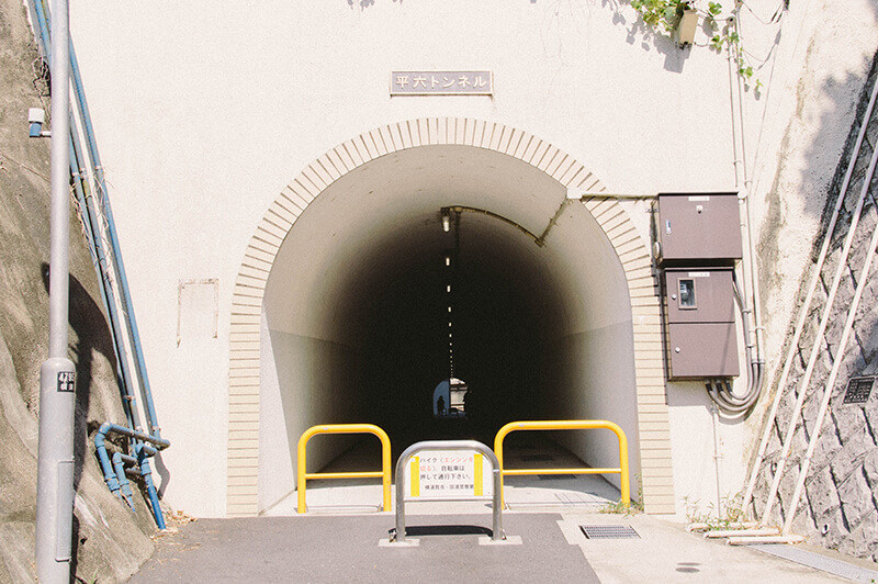 で、出たーー!!!この写真だと全く表現できてないんですが、これすげー怖いんですよ!前述したとおりめっちゃ入り組んだ住宅街を平日に一眼レフぶら下げてうろついて、たぶんこの辺だよな~こっちかな~ときょろきょろしつつ、ふと左の道を覗いたら突然現れるんです。住宅街に。ぽっかり大きな穴が。正直めちゃくちゃ興奮しました。今までそんなにトンネルにテンション上げることはなかった人生を歩んできましたが、私が普段イメージするトンネル…大きいサイズで、電車とかが通って、通過してる間は携帯の電波が使えない、そういうレベルでしかトンネルのことを見ていませんでした。ただ、このとき私の目の前に現れた“隧道”はあまりにも生活に密着しているんです。近くの民家には洗濯物が干してあり、どこからかテレビの音が漏れて聞こえてくる…お昼過ぎでしたからワイドショーなんかを見ながらコロッケそうめんを食べているようなその空間に突如現れた大きな穴。え?ここに!?マジかよ!という驚き。暑いからか周囲に住民は一切見当たらないのも謎の雰囲気があります。そしてサイズ感もトンネルにしてはとても小さく、人がすれ違うことはできますがその程度です。そして生活に密着してるどころか、トンネルを出るとすぐ真横に民家の玄関があります。む、むちゃくちゃだ。なんだこれ…。あとなんかトンネル出た真ん前が私有地なのか道路?の手すりにめっちゃ洗濯物干してあるの…。何が起きてるんだ…!?トンネルひとつにものすごく衝撃を受けました。